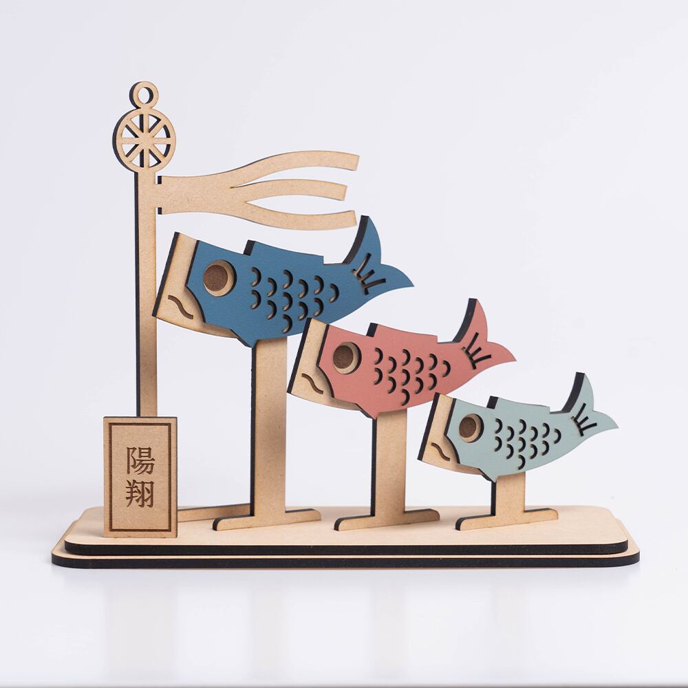 やさしいパステルカラーで仕上げた名札付きの鯉のぼりの置物です。