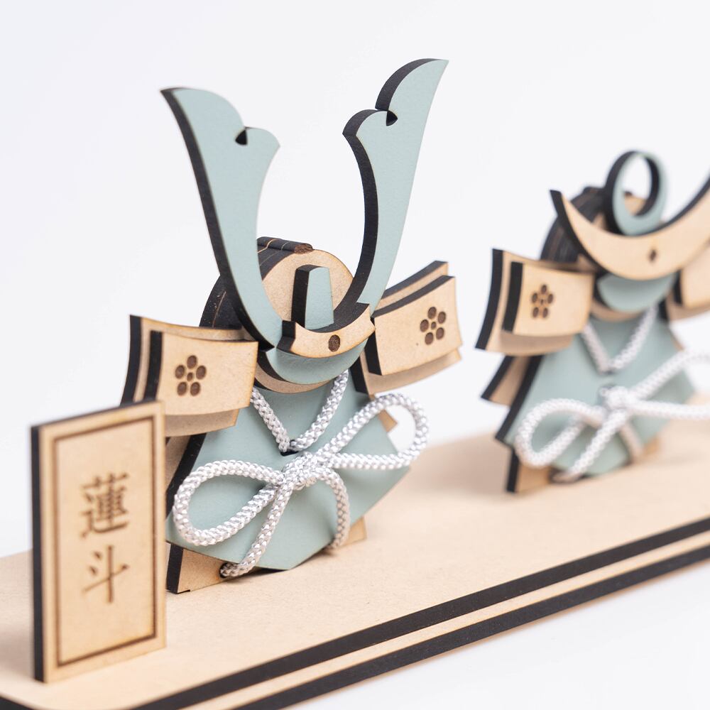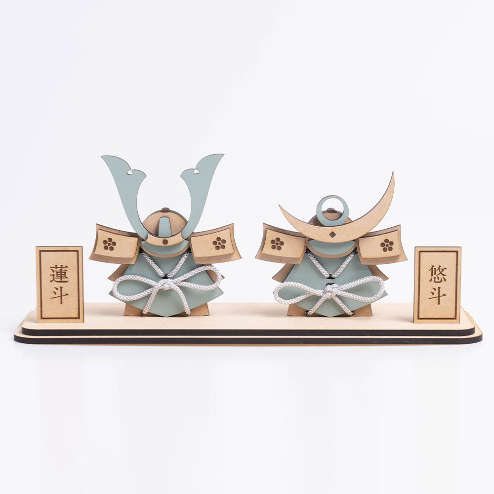 「兄弟それぞれに名札をつけられるように」というお客様の声から生まれました。デザインの異なる2つの兜が横並びで配置され、それぞれにお名前を刻んだ名札をお付けできます。